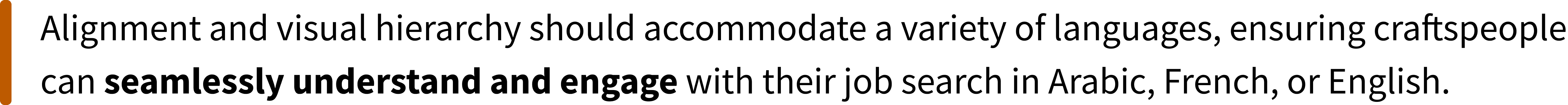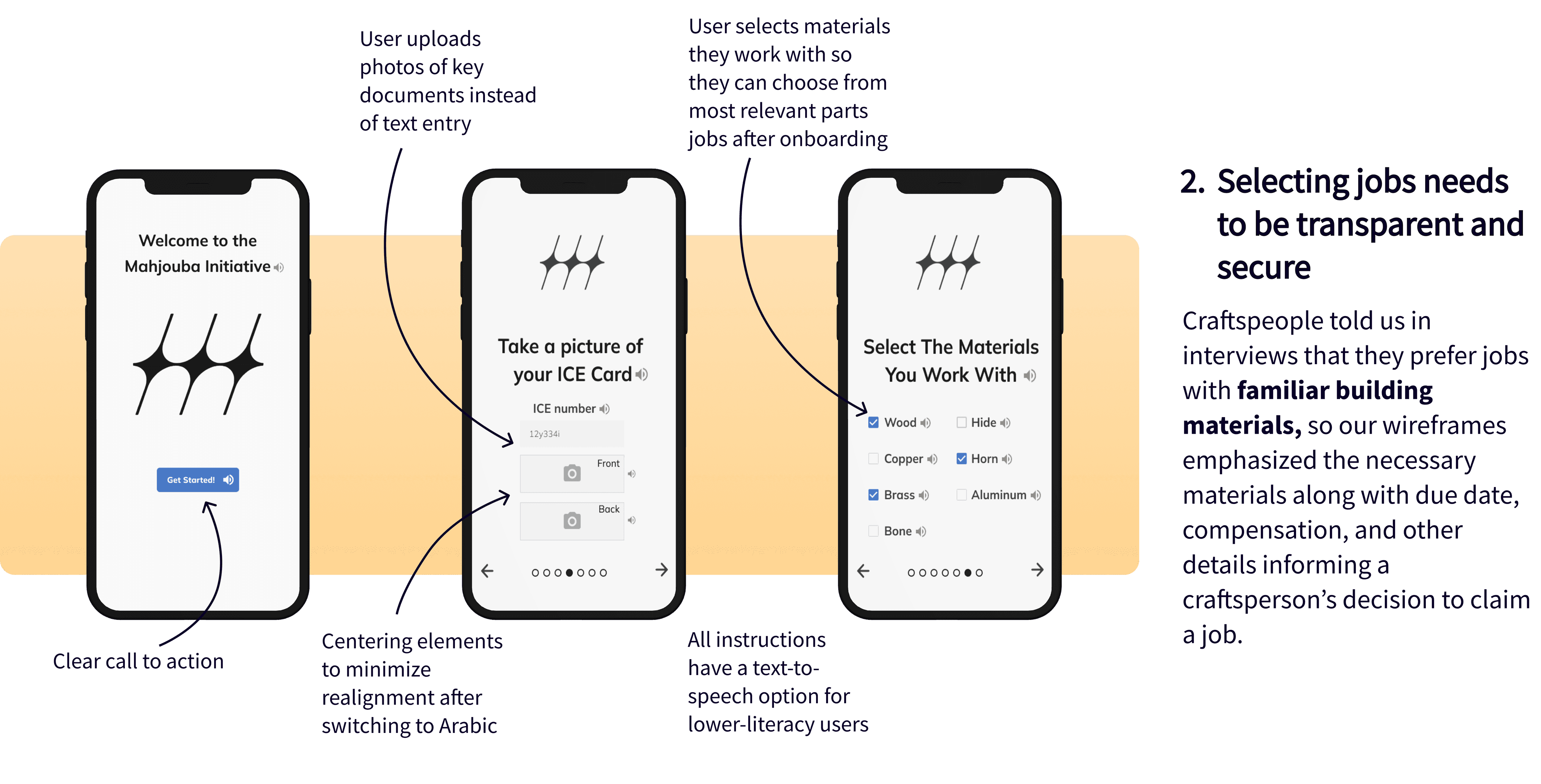 Creating our style guide came hand-in-hand with iterating on flows from user feedback and DALI design critiques. As we evolved our wireframes into high-fidelity mockups that followed the right-aligned layout our users were used to, we prioritized clarity and ease of use to help craftspeople find job matches in the Mahjouba supply chain. To ensure an inclusive, comfortable experience, we remained attentive to our users' varying literacy levels and multilingual needs.