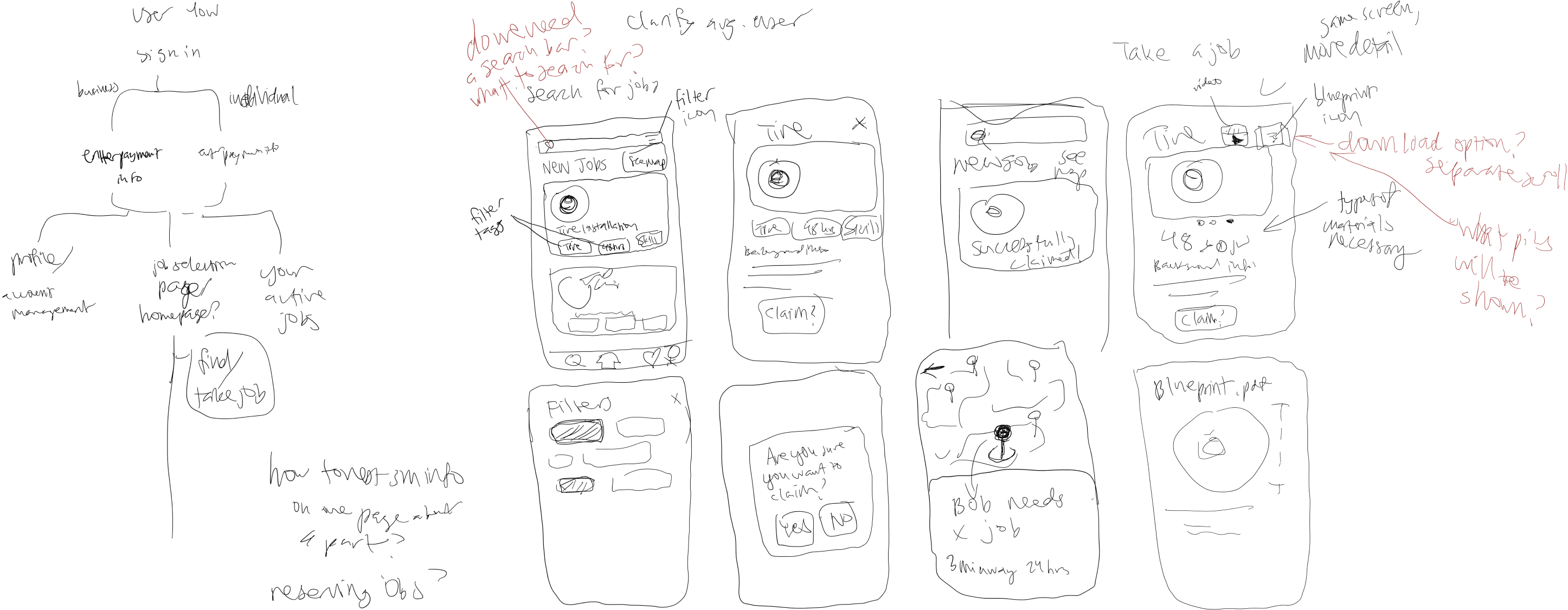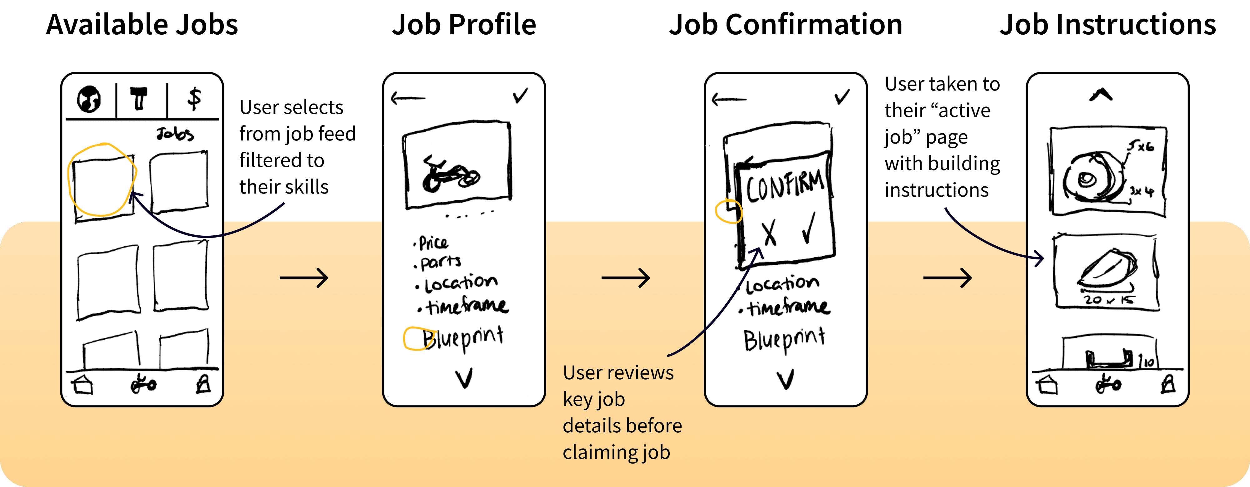 After clarifying priorities and deciding main flow steps with our client, we visualized our various feature ideas by drawing a first pass at flow sketches to illustrate a craftsperson's job selection process.
