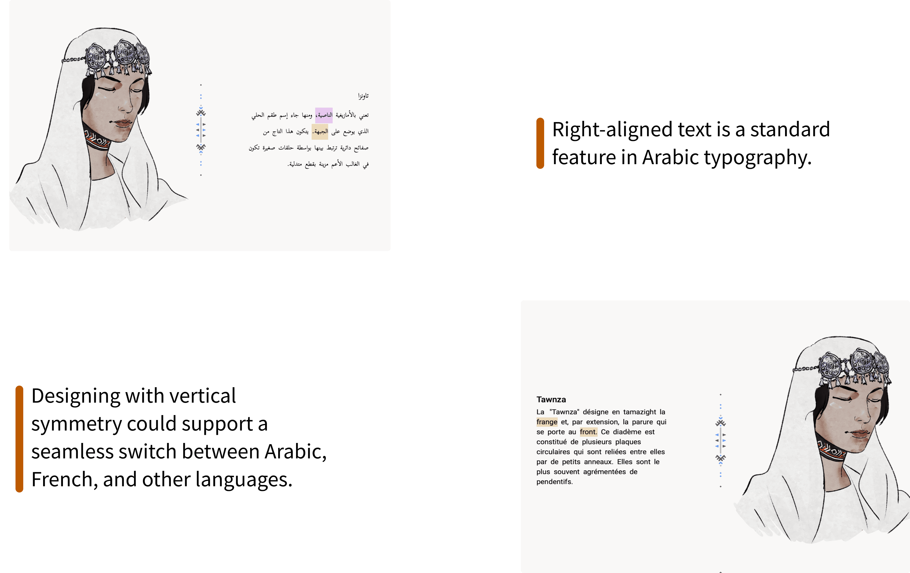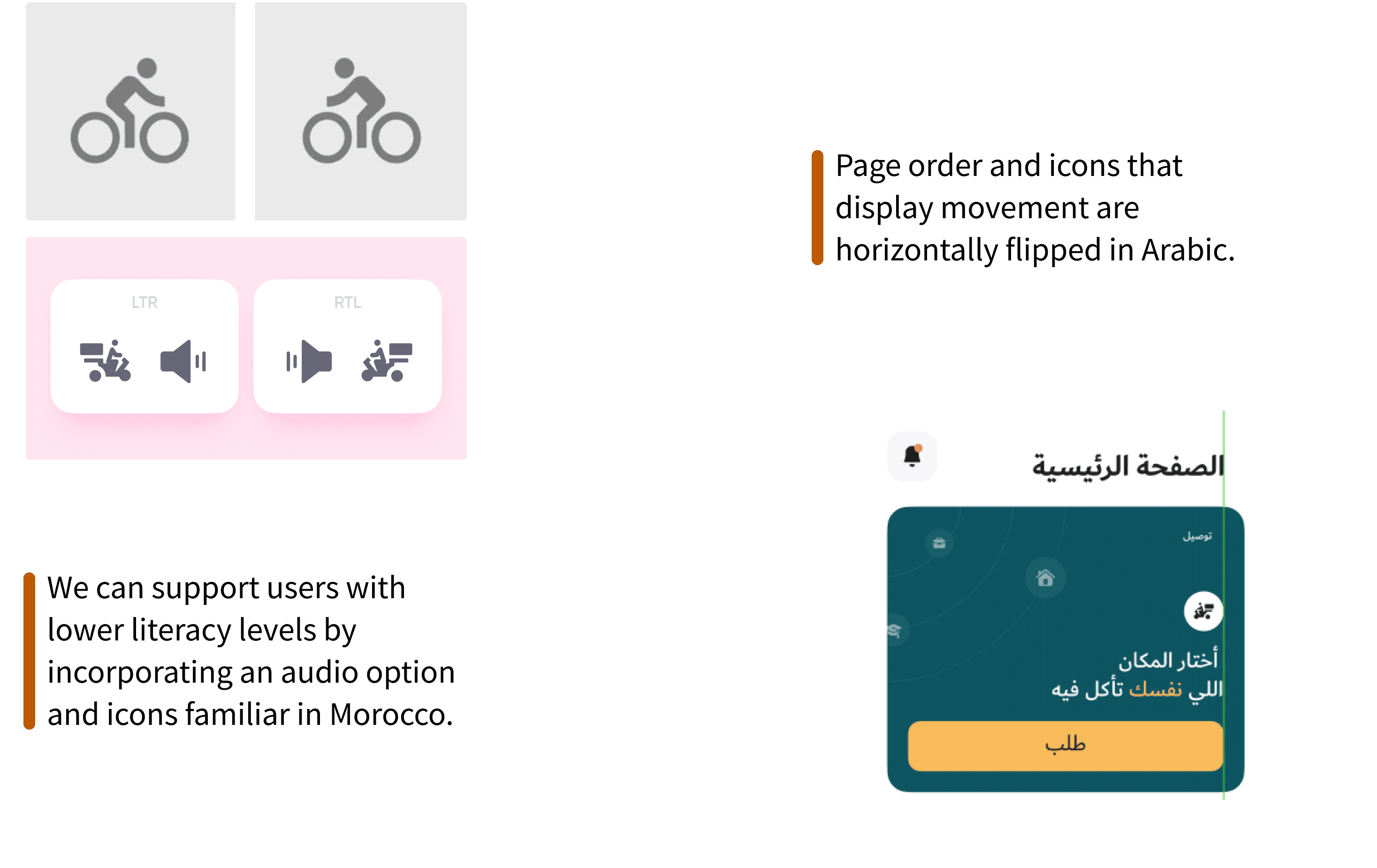 We analyzed Arabic text and Moroccan digital interfaces, noting best practices for a user-friendly experience. Our focus included right-to-left text flow, horizontally flipped icons, and accessibility considerations for users with lower literacy levels.