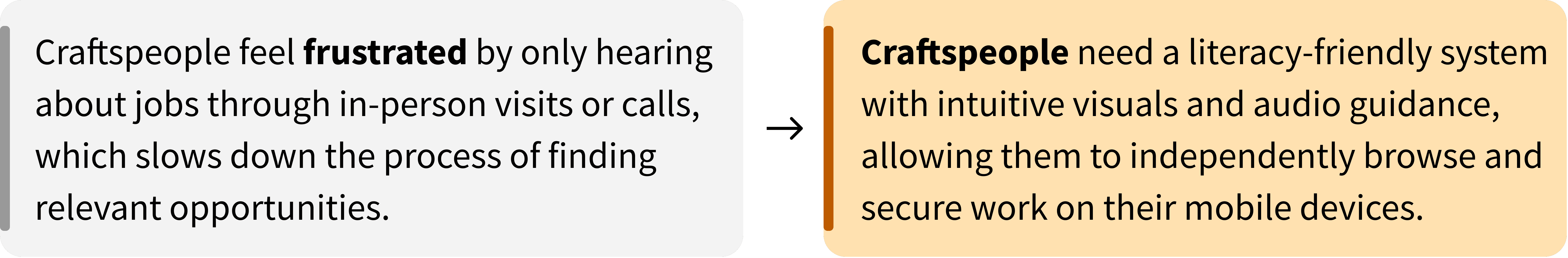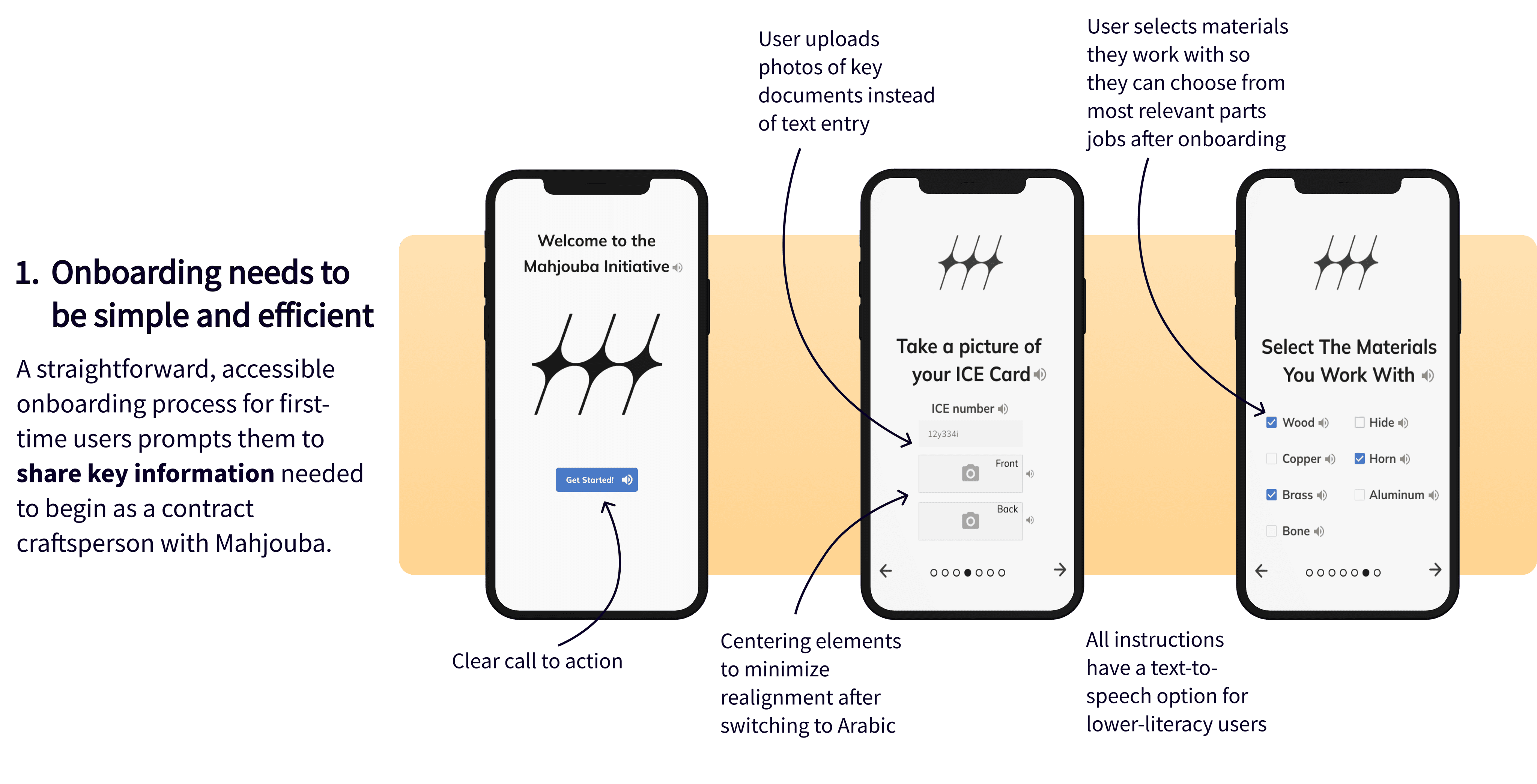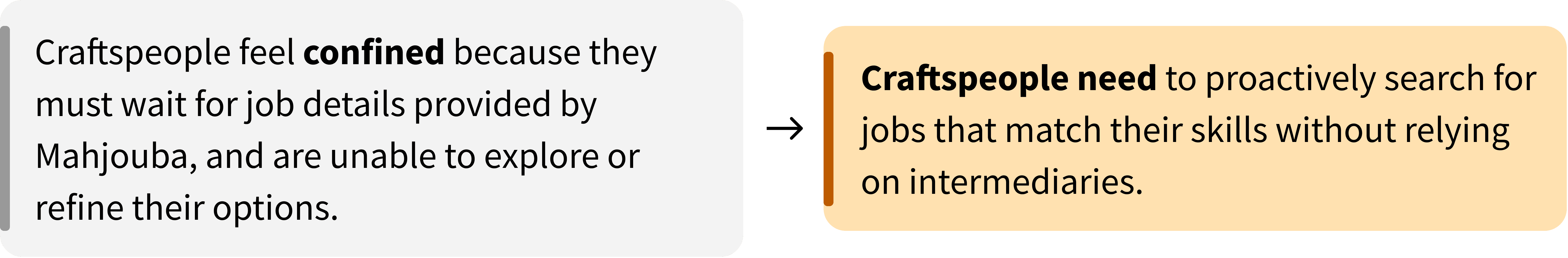 We channeled our user research findings into critical pain points that prevent effective digital collaboration between craftspeople and the Mahjouba Initiative.