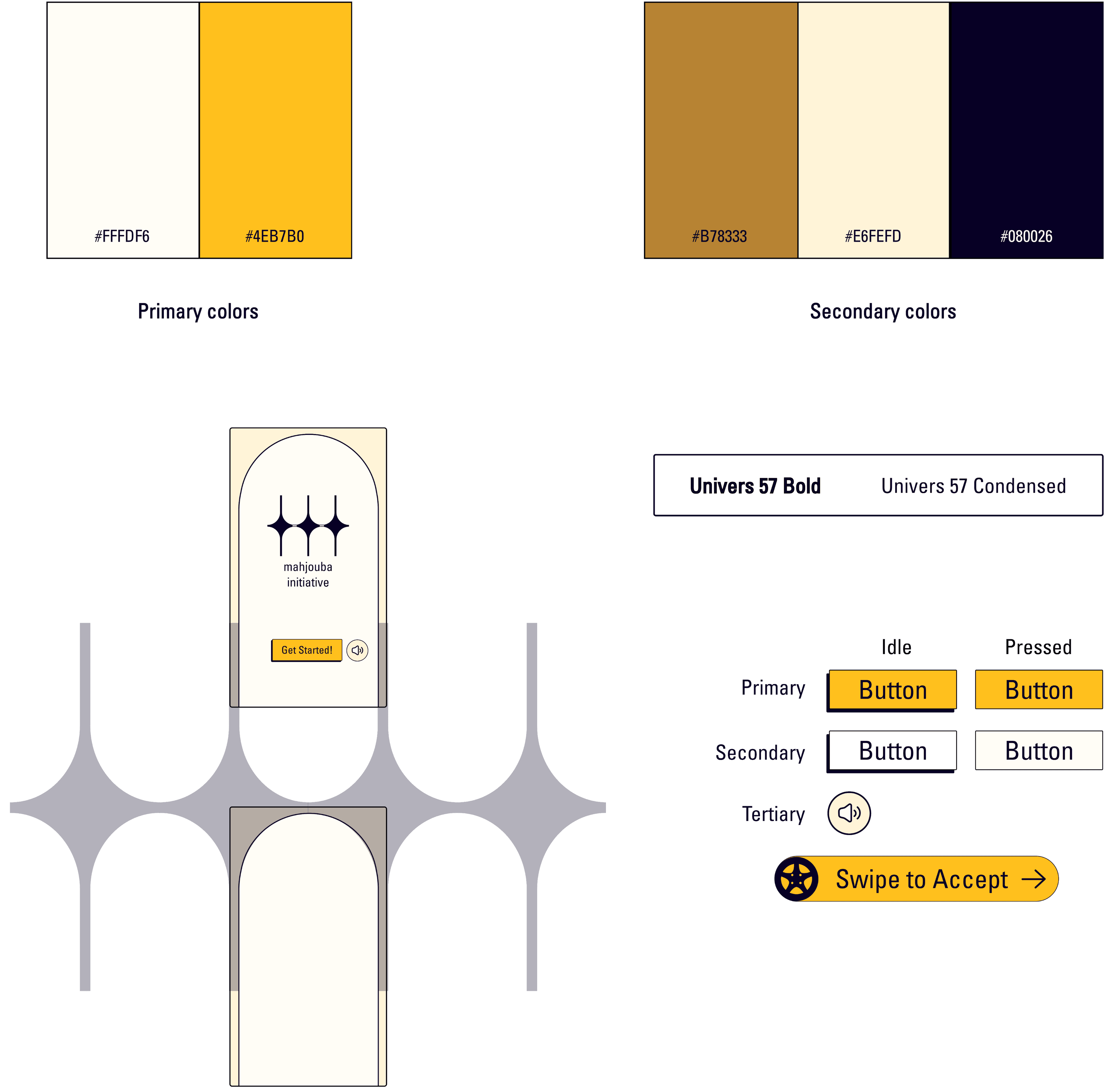 We created our style guide with the Mahjouba Initiative's main font and bright marigold theme in mind. Inspired by Figma and Gumroad's striking neubrutalist color schemes, we aimed to enhance readability through a playful yet defined UI design: bold colors, striking text and drop shadows to indicate if a button is clickable.