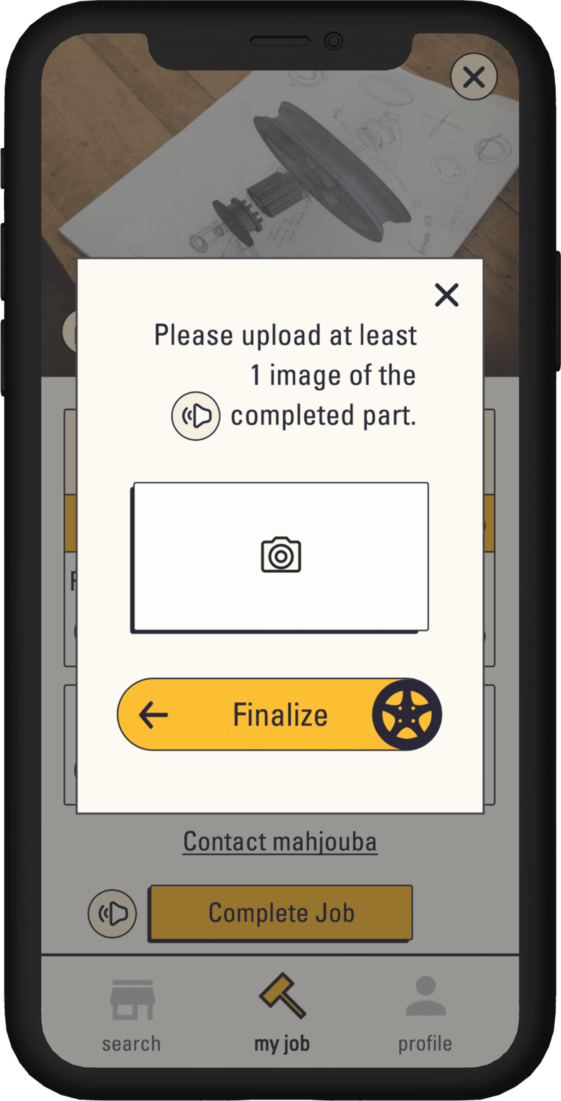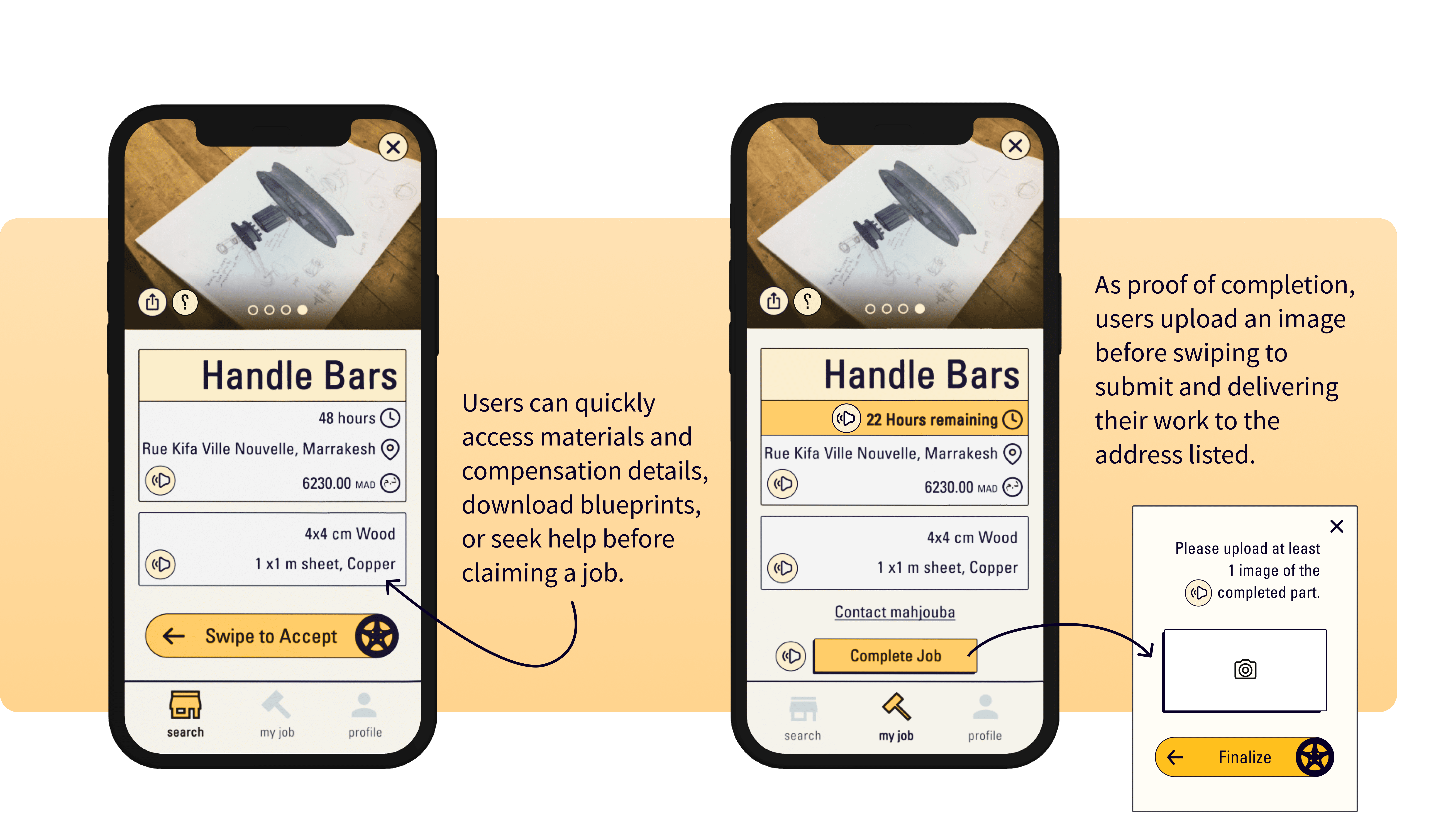 In alignment with job search, we designed the job completion flow to emphasize transparency and deliberate action. Key details like due date, required parts, and delivery location are highlighted so craftspeople know exactly what is expected. To reinforce intentional submission, we added a motorcycle wheel swipe to make the final handoff feel engaging and conclusive. A share feature on the "My Job" page also enables users to send blueprints via WhatsApp, the most relied-upon tool among our users and stakeholders.